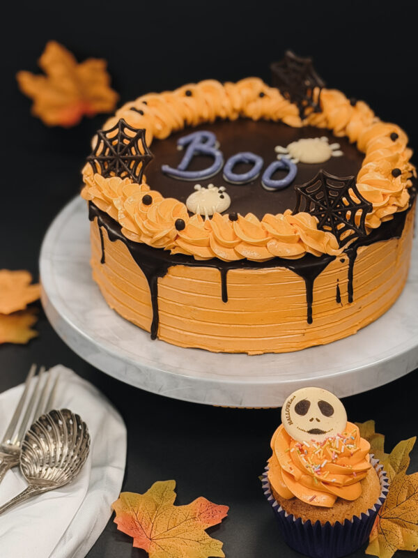 Our Halloween orange buttercream cake features fluffy layers, bright citrus icing, and festive décor.